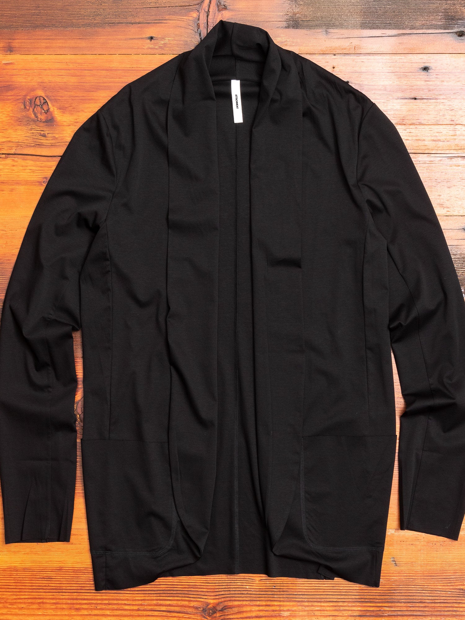 • The Attachment Stole Collar Cardigan is a signature design from Kazuyuki Kumagai. Crafted from a silky smooth fine-knit cotton, the garment is designed with a curved hem and sleeve paneling to accentuate its draping look. With a scarf-like collar the piece crosses the line between a blazer and a cardigan, while the lightweight fabric allows it to be worn as both outerwear and a unique under layer.