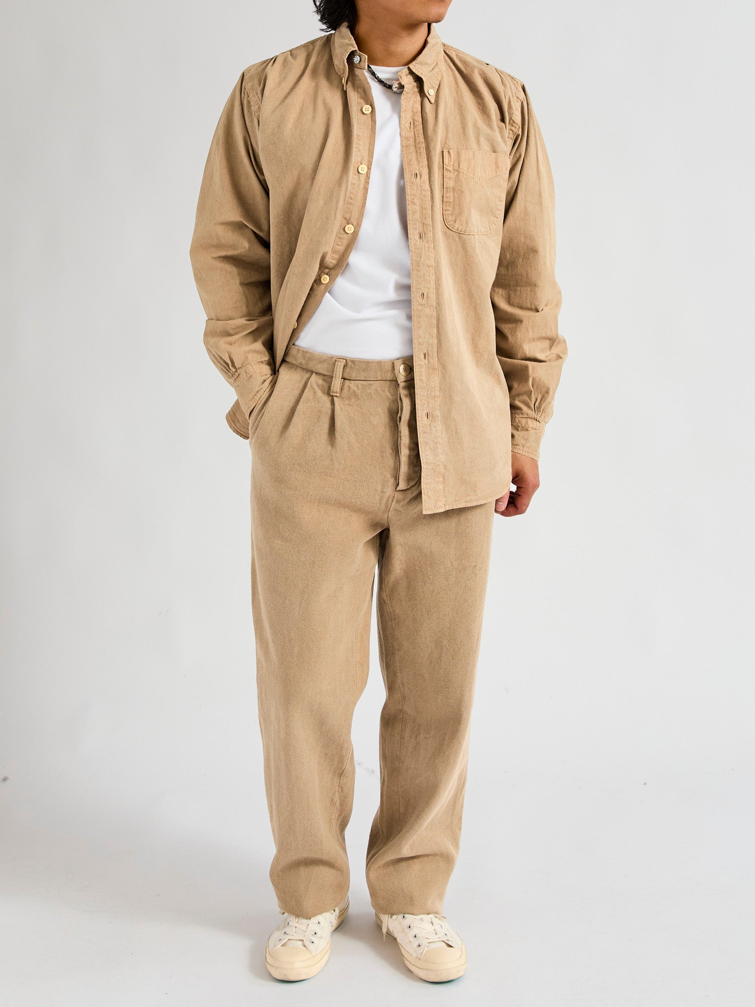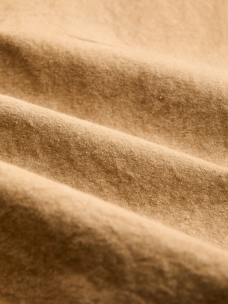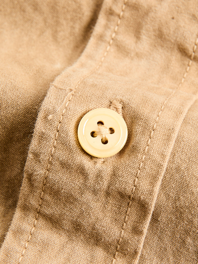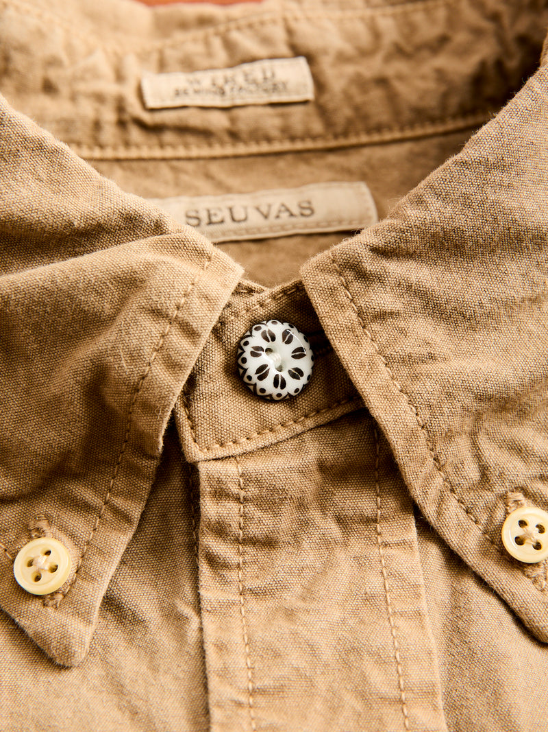 • Crafted from the world’s finest canvas, SEUVAS’s Tassa Authentic Button-Down Shirt is made from Kurashiki Hampu, a renowned fabric celebrated for its texture and durability. Originally used in boat sails, Kurashiki Canvas is woven on century-old shuttle looms accentuating the natural cotton fibers nep texture and durability. Made in partnership with local Japanese cafes, the brand recycles coffee grounds for their dyeing process, echoing the brands commitment to reuse and sustainability. The shirt comes sewn on vintage machinery and features reinforced double needle construction throughout.