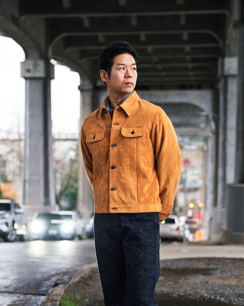 • Inspired by trucker jackets worn by Sylvester Stallone throughout the Rocky films, the aptly named “Boxer” jacket features a supple horshide suede sewn in Japan. Crafted from chrome-tanned French horsehide suede, cut to a lightweight 0.8mm thickness for a soft, supple hand feel. Finished with a smooth cupro interior lining, the jacket features dual chest pockets, waist adjusters, and custom hardware for a clean, refined take on a classic silhouette.