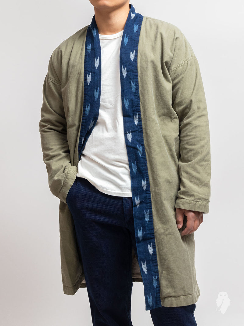 • The Traveler Coat from SOULIVE is a twist on the brand's signature Haori style. Made from a military twill fabric, the full-length coat features indigo-dyed Japan Blue Co. archive fabric along the placket and is fitted with a floral ripstop liner. The coat features a minimalist design free of zippers or ties, and is fitted with two discrete welt hand pockets at the waist.