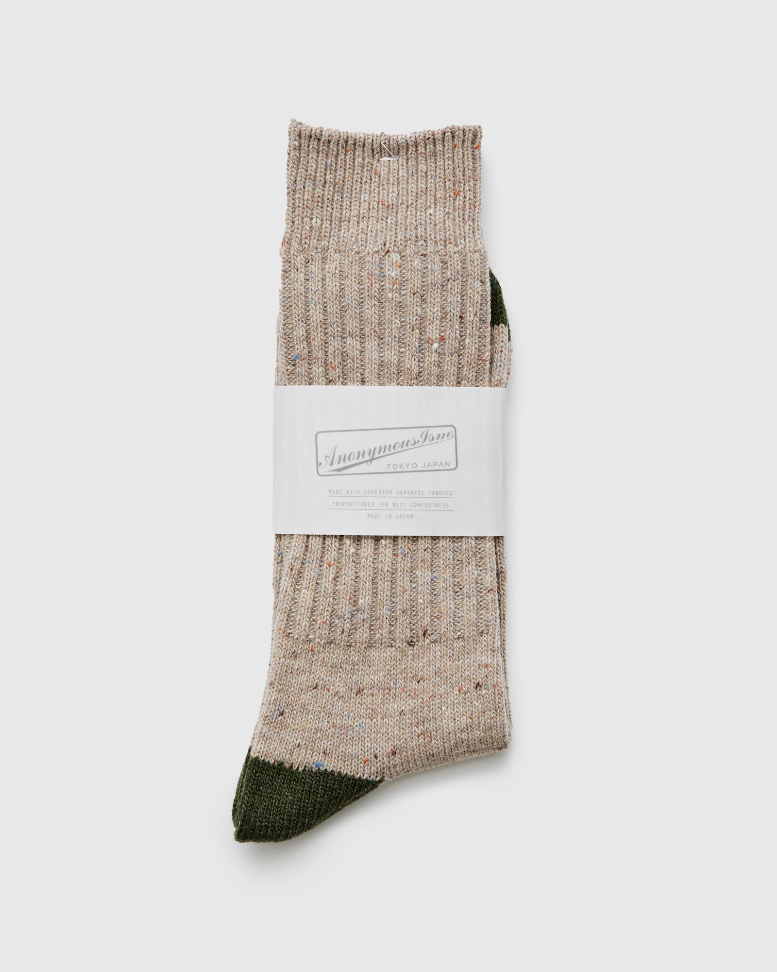 • The Tweed Nep crew socks from AnonymousIsm are warm full-length socks made from a heavily-textured wool blend fabric. The socks feature a two-tone color design with contrasting neps throughout. Each pair of AnonymousIsm socks are expertly crafted by their team in Tokyo, Japan.