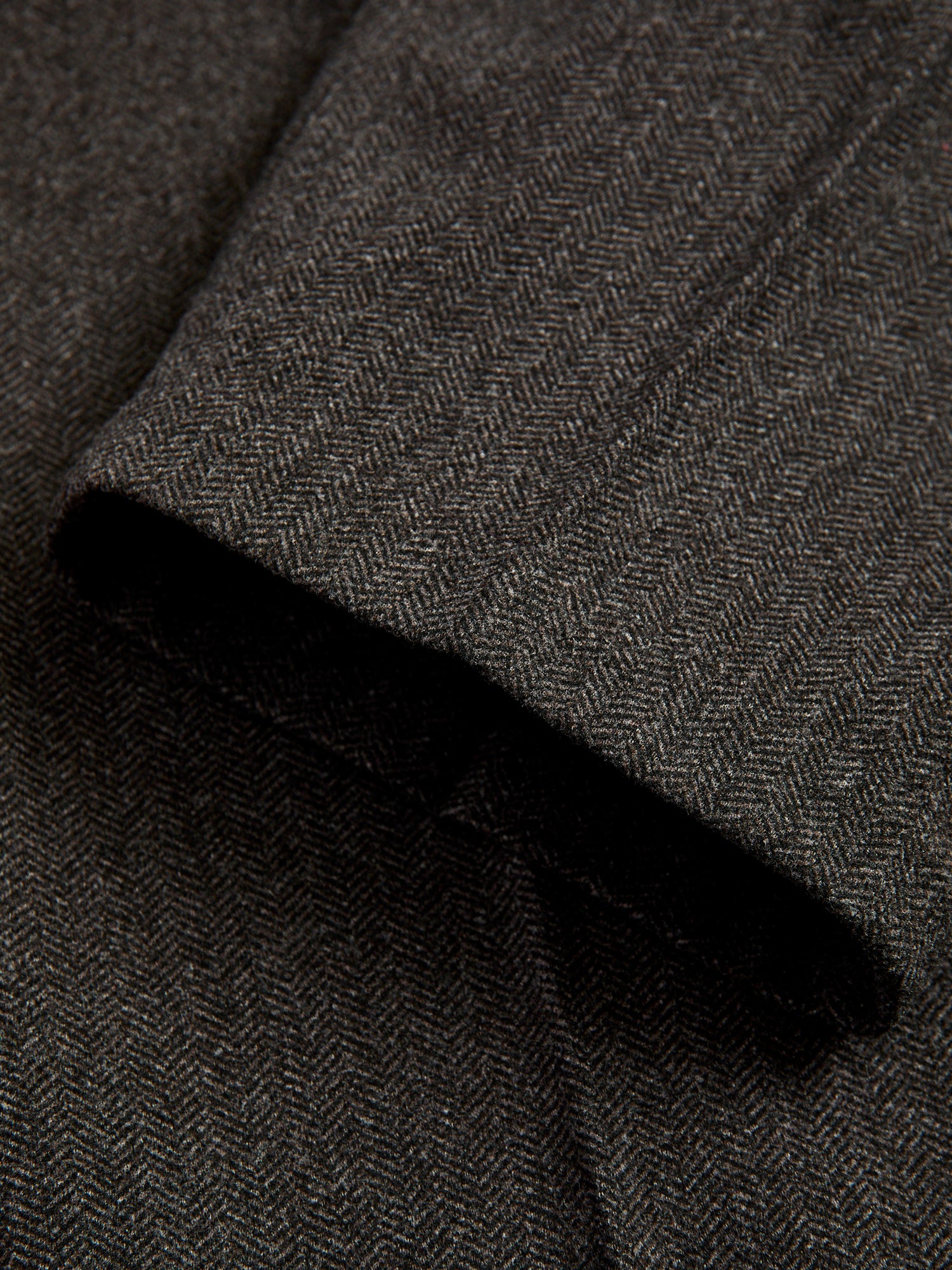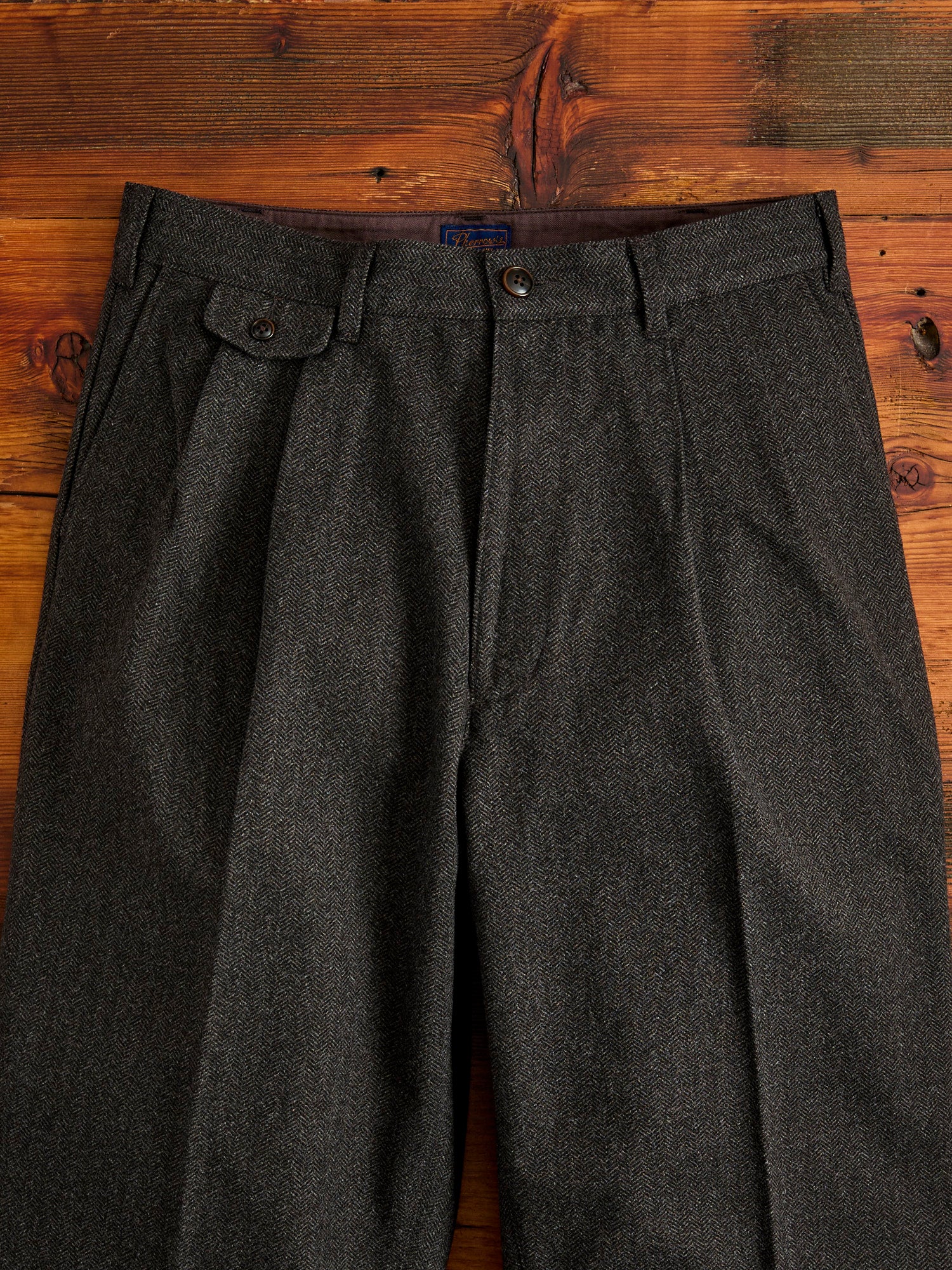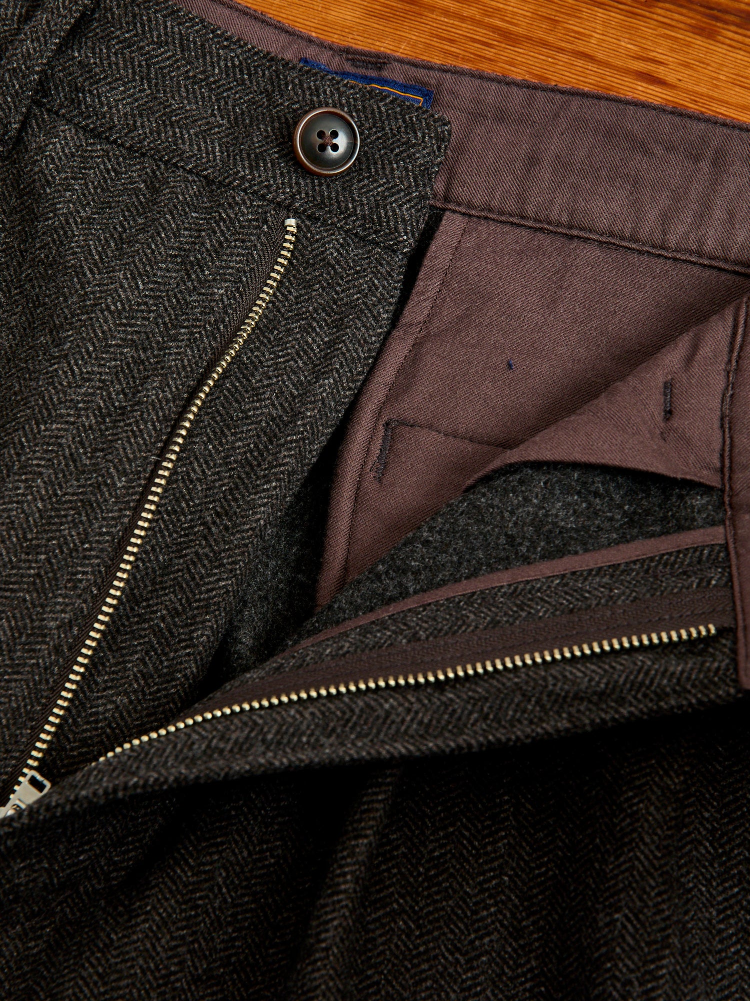 • Pulling from early 1900s casual suiting, these pleated trousers come cut in a relaxed fit silhouette sewn using a poly herringbone twill fabric. The pants sport a medium-weight heft and soft-to-touch brushed surface texture. Fitted with large pockets at the waist, button closure coin pocket, and welt pockets at the rear.