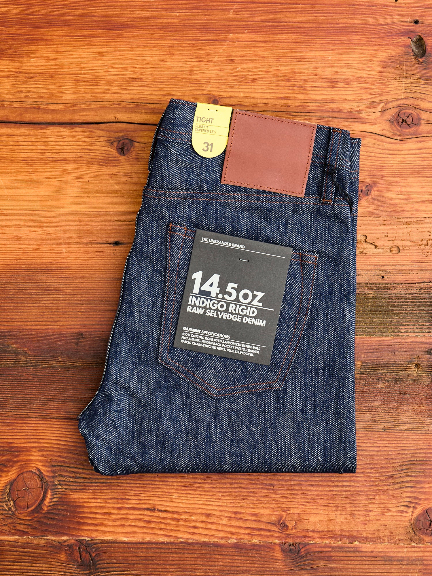 • Unbranded's standard 14.5oz denim is a stiff and rigid raw denim built without the frills of designer jeans, but made to withstand a beating. The fabric will soften up with wear, typically breaking in fully after two weeks time, depending on activity level. The jeans are clean and uniform, but will develop distinct fading patterns based on your wear.