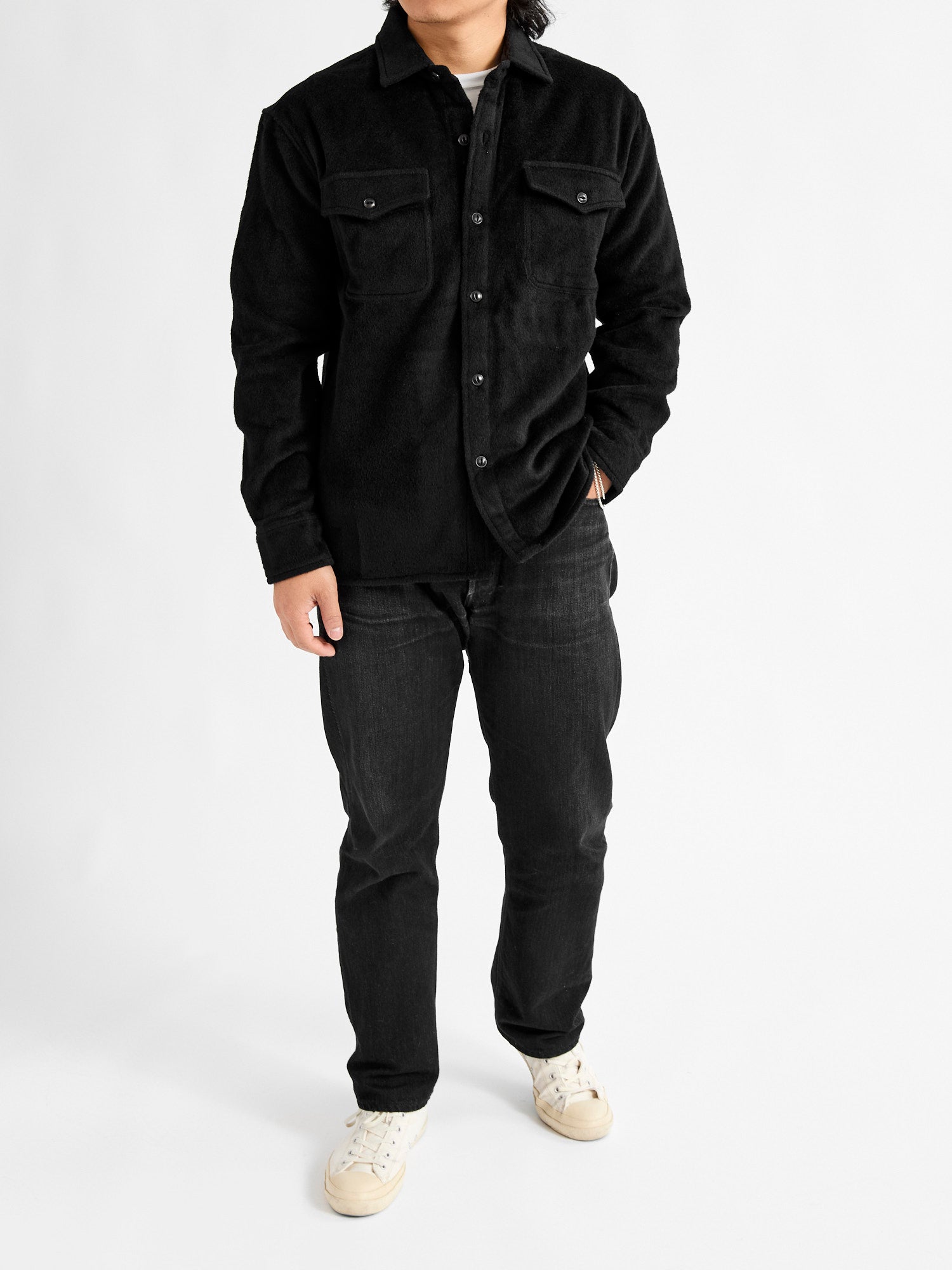 • The USN Overshirt from 3sixteen is modeled after vintage CPO shirts. Crafted using a custom wool-angora fabric, the shirt sports a soft, brushed exterior and lightweight feel. Fitted with replica BDU buttons, the overshirt is sewn with two front chest pockets and the signature 3sixteen cross-stitched yoke at back.