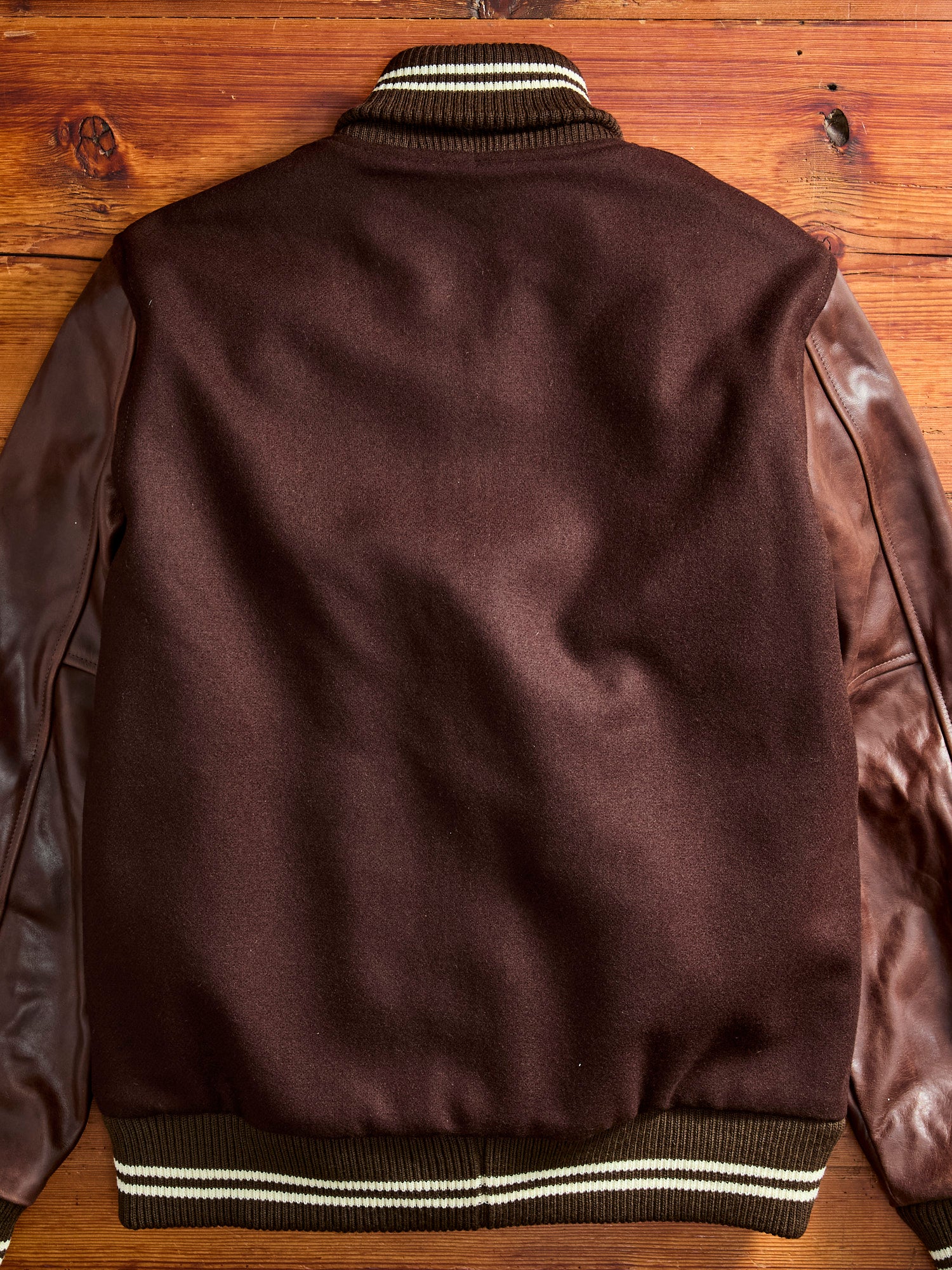 • First introduced in 1951, Dehen's Varsity Jacket is a masterclass in traditional Americana. Handmade using time-honored methods at the brand’s Portland, Oregon factory, the jacket comes built using a 24oz melton wool body with cowhide leather sleeves. Fitted with a luxe quilted liner, leather accenting, worsted wool trim, and an adjustable roll collar.