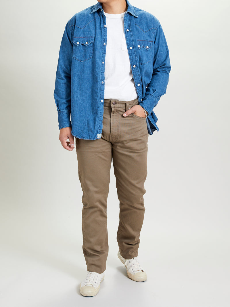 • This classic button-down shirt from orSlow is made from their proprietary 6oz denim fabric, washed to a light vintage color. The shirt is sewn in classic western style with pointed yoke and pocket flaps, and completed with beautifully distressed metal snaps. Cut in a loose vintage fit for a relaxed look.