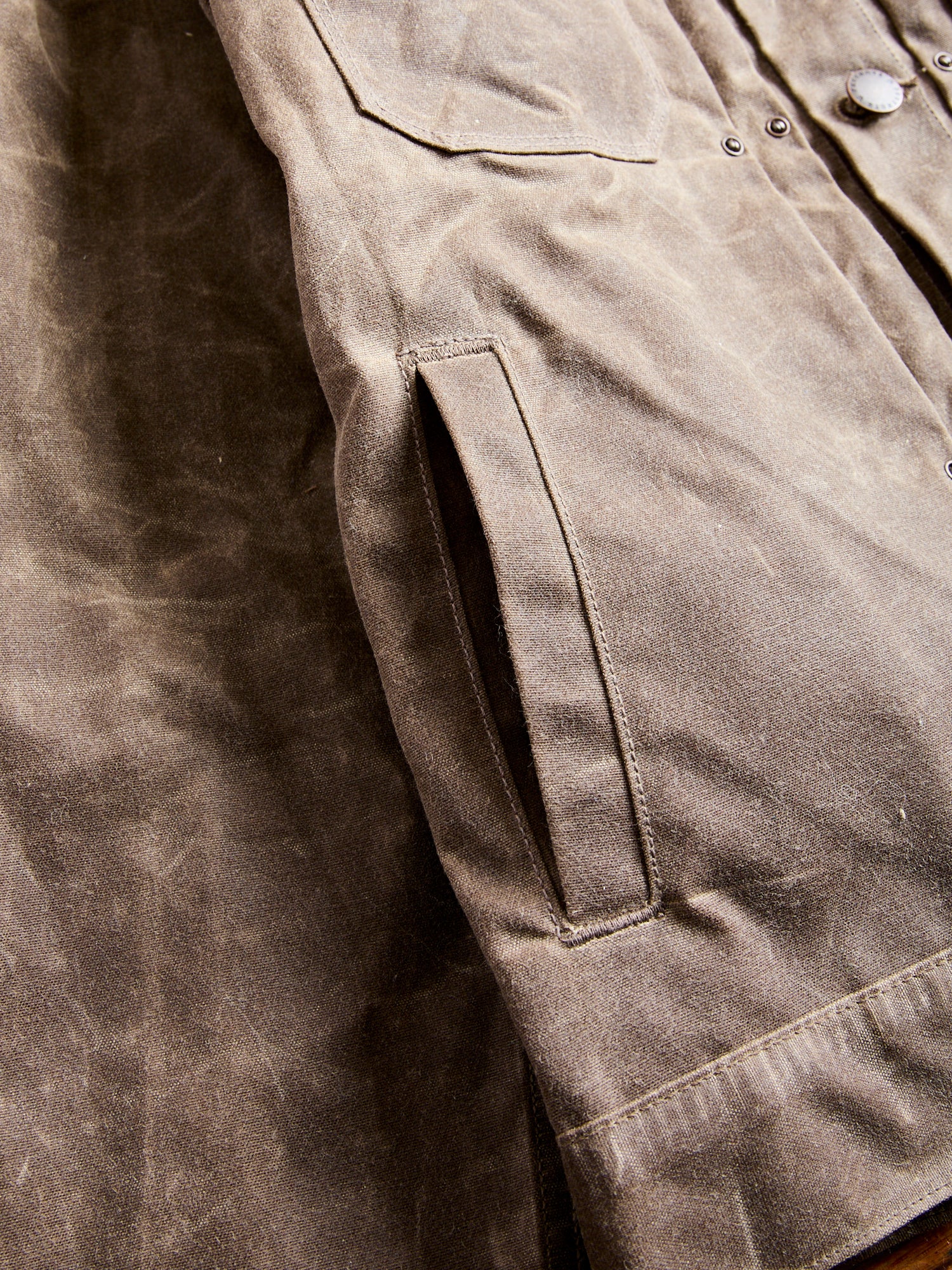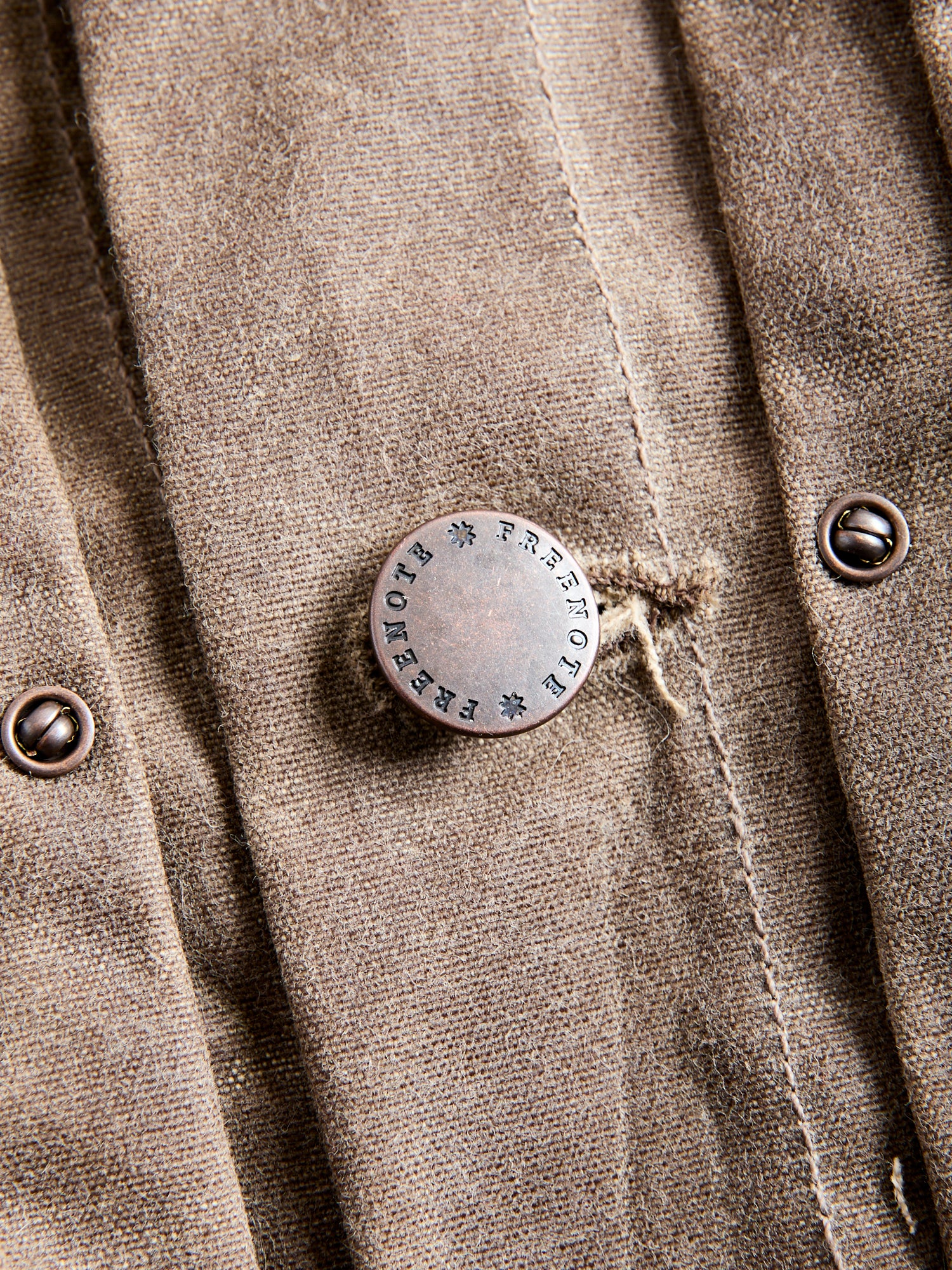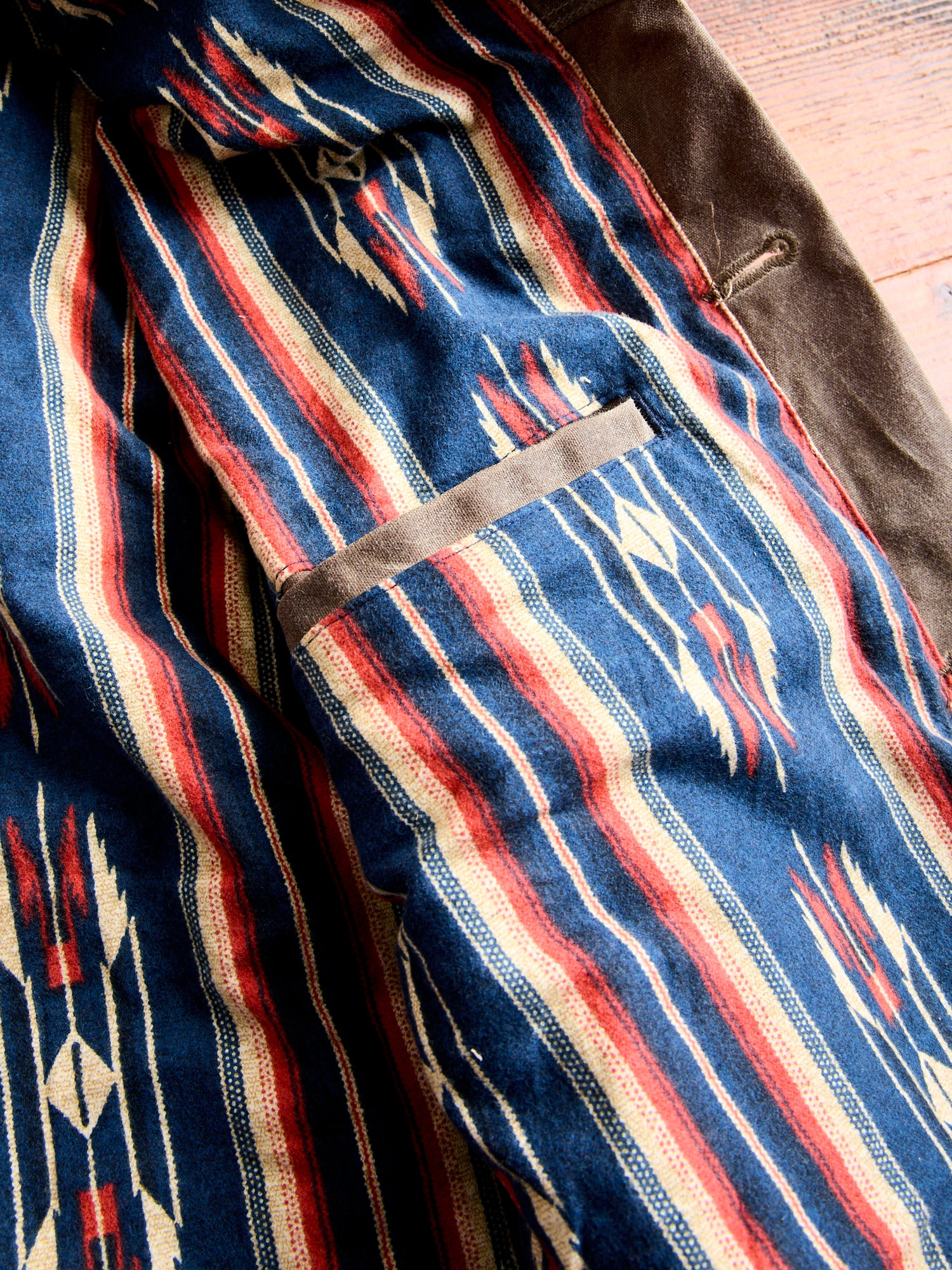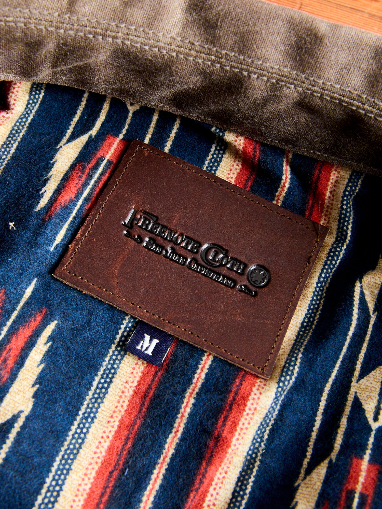 • The Riders Jacket from Freenote Cloth is a heritage design drawing from both ranch and classic rider jackets. Fitted with fully functional shoulder gussets, this installment is sewn using a 10oz Martexin waxed canvas for extra protection against the rain. The interior of the jacket features a custom Southwestern-printed body liner, along with fully lined satin sleeves. Finished with custom metal hardware from Kentucky, double needle construction, and an array of functional pockets throughout.