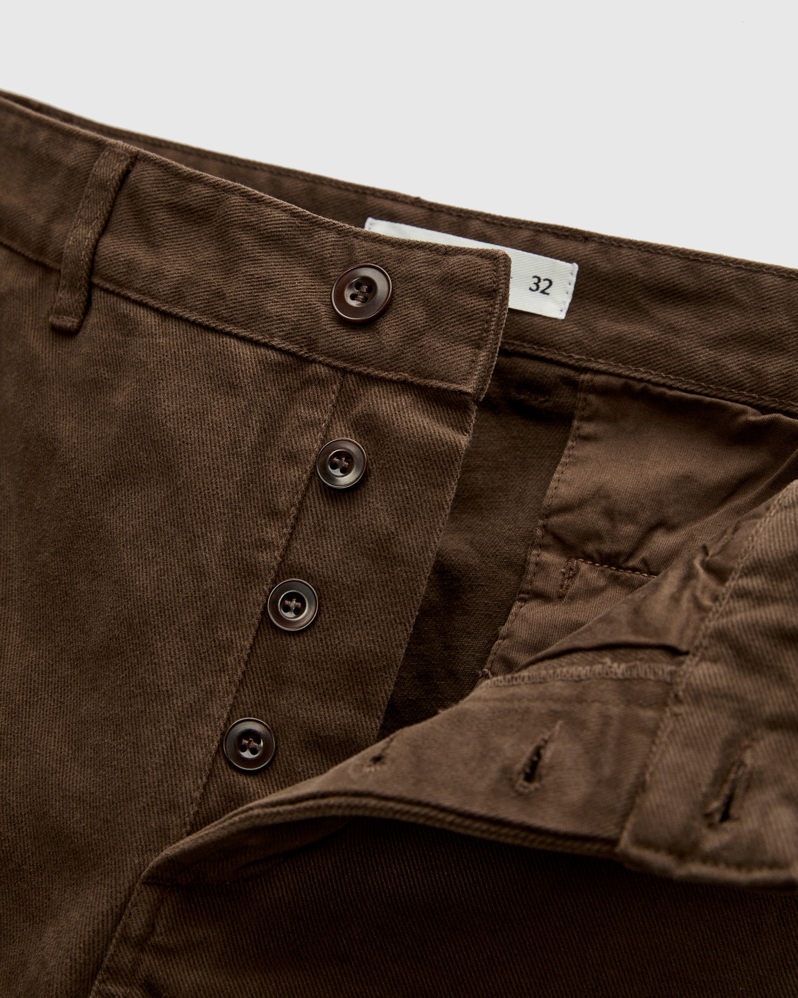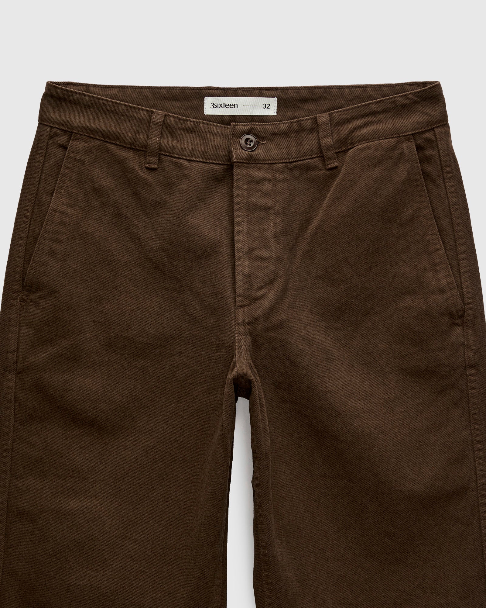 • The Work Pants from 3sixteen feature a straight leg, high rise fit reminiscent of traditional workwear. Cut from a heavyweight cotton chino fabric, the pants showcase a pronounced twill with a structured drape. After sewing, the pants are garment dyed and rinsed, giving the fabric a soft, broken-in look and feel. Finished with natural corozo buttons, slant pockets at the waist, and welt pockets at the rear.